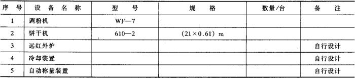 | 释义 | 焙烤食品设备配备实例 详见表5-2-4、表5-2-5、表5-2-6所列。 表5-2-4 班产2000kg饼干的主要设备