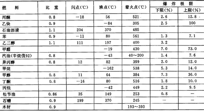 | 释义 | 燃烧的基本条件及发展过程 燃烧是可燃物(即燃料)快速氧化,伴有火焰、发光和(或)发烟现象的放热反应。其先决条件是必须有燃料和氧化剂,并达到一定的温度才能发生化学反应。燃料、氧化剂和热(点火源)是燃烧的三要素。有时可用燃烧的三角形表示。缺少任一要素就不能燃烧。这一原理对防火和灭火十分有用。有时化学反应本身也成为一个要素,使三角形成为一个四面体,每个边代表一个要素。如果除去四面体的任一边,就能灭火。 在防火安全中,燃料的性质很重要。其中燃料与氧化剂的反应能力更重要。火灾中主要氧化剂是空气中的氧,此外,氯、氟也能与某种燃料如氢反应而着火。 气体燃料、可燃蒸气、粉尘与空气必须在一定浓度范围内,才能燃烧或爆炸。这个范围称为燃烧或爆炸的极限浓度,以浓度的上下限表示。只有混合物的比例在上下限之间,加上点火源,混合物才能燃烧或爆炸。 燃料的温度特性也很重要。燃点或着火点是固体燃料或液体燃料开始持续燃烧的最低温度。固体燃料一般需要吸收一定的热量后才着火,但表面温度不得低于其燃点。燃料在没有外部火花、火焰等火源时,因受热或自身发热并蓄热而自燃的最低温度叫自燃温度。液体燃料表面蒸气与空气的混合物与火接触,初次出现蓝色火焰的闪光时的温度叫闪点。闪点是表示液体燃料危险性的一个重要指标。我国将闪点低于45℃的液体称为易燃液体,超过45℃时称为可燃液体(美国规定为37.8℃)。 液体燃料的蒸气密度和比重也很重要。可燃蒸气密度大于1时,往往会在空气中下沉并把火焰带下去,小于1时向上升。液体和固体的比重小于1时,会浮在水面上。了解这些性质有助于灭火。几种常见的燃料性质见表5.2.2-1。 表5.2.2-1 几种常见的燃料性质