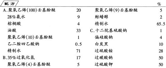 将B中的精制水置于反应罐内,加入聚氧乙烯(9)壬酚醚,加热至60℃,搅拌直至呈透明溶液,停止加热,再加入其余成分,搅拌混合均匀,即成B液。