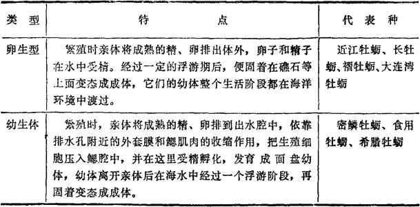 2.牡蛎的食性 牡蛎的食料主要是单细胞浮游生物和有机碎屑。幼体以小型单胞藻,如硅藻、扁藻和金藻等为饵。 三、繁殖和生长 1.繁殖期 牡蛎的繁殖期多在本海区水温较高、比重较低的月份里。例如近江牡蛎和长牡蛎,在南海珠江口附近,繁殖期在5-8月;而在渤海和黄河口的是7-8月。褶牡蛎在福建、广东沿海4月份就进入繁殖期,而在青岛则是7-8月。 2.性腺 胃的周围是性腺的主要分布区。牡蛎性腺发育可分为三期。第一期性腺少而薄,呈淡白色,内脏块表面大部分是褐色的消化腺;第二期性腺呈乳白色,遮盖了大部分消化腺;第三期的性腺全部遮盖了消化腺,内脏块非常饱满。卵子和精子在水中容易散开。 3.性别 牡蛎有雌雄同体和雌雄异体之分。它们经常发生性别的转换。牡蛎的性别可用显微镜鉴定。如果生殖细胞是圆形、梨形或多边形,则是雌蛎的卵子,而雄蛎的精子要用高倍显微镜才能看到。精子分头尾两部分。头部圆球形,尾部较长。也可用肉眼鉴别。用吸管取一滴成熟的性腺,放在玻璃片上的一滴海水中,如果呈微小颗粒状很快散开,是雌蛎;如果呈烟云状不易散开则是雄性。 4.繁殖方式(表12-2) 表12-2 牡蛎的繁殖方式