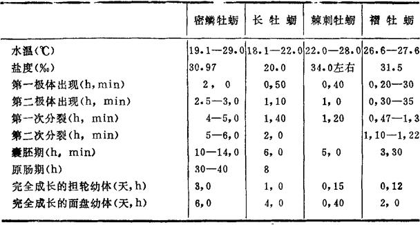 5.牡蛎的发生及其与环境条件的关系 各种牡蛎的发生情况基本是一致的(图12-1)。表12-3列出四种牡蛎胚胎发生的时间。在适温适盐的范围内,当水温和盐度高时,牡蛎受精卵孵化的速度就较快;当水温和盐度低时,孵化速度也随着变慢。牡蛎幼体在海水盐度高时,集中于水的表层,海水盐度低时,降至底层生活。