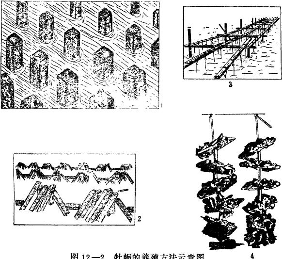 图12-2 牡蛎的养殖方法示意图 1.立石养殖法 2.桥式养殖法 3、4.垂下式养殖法 六、收获与加工 1.收获 收获期一般在蛎肉最肥满的冬、春两季。褶牡蛎养1-2年就可收获。近江牡蛎和大连湾牡蛎要养3-4年才能收获,在条件比较好的海区,2年可收获。在底质平坦的海区多用蛎子网拖捞。在底质凸凹不平的岩礁海区可先用钢丝网耙取,再用抄网捞起。也可用蛎夹采收。在潮间带可在干潮时装船,满潮后运回岸上开壳取肉。垂下养殖的牡蛎,可以在船上采收。 2.加工 一般用蛎刀开壳取肉。加工方法有鲜干、熟干、盐渍或制罐头等。鲜干时将新鲜蛎肉在海水中洗净再晒干,用竹篾穿成串,再晒1-2天,即成蛎干(又称蚝豉)。熟干是将蛎肉快火加热煮熟,然后加入1.5-2.0%的食盐拌匀,滤去水分,将蛎肉晒干即成。在阴天可用烘干,温度控制在80℃左右。烘干后再经微晒即可。煮蛎肉的汤水经过滤去杂质,然后浓缩到比重为1.262停止加热,加入其他佐料和防腐剂则成牡蛎酱油(蚝油)。 (编者:许国领 审者:王如才) |