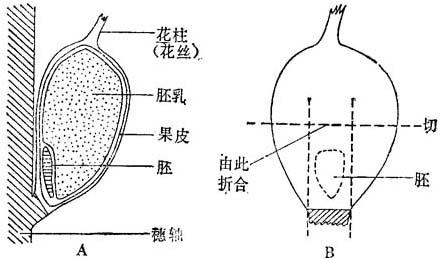 图17-3 用幼苗芽切段启动组织培养体 (7)接种5-10小片在培养基上(约10ml),装在直径6cm培养皿内。 (8)将初生根切成1-2cm外植体用于根培养,接种5-10段在培养基上。有些基因型向根尖部分的反应可能降低。 (9)光培(约2000lx),25℃。普遍用Green与Phillips(1975)改进的MS培养基。 3.未成熟胚 (1)进行控制授粉。 (2)胚达到培养要求的大小所需时间,因基因型和生长条件而异。 (3)仔细地反摺谷皮(不要剥离)或纵剖全部谷皮露出已授粉的穗,观察胚的发育状态。各个地取下颖果呈钝头压舌板形。经实践取得经验,有可能从植株上很快取胚(图17-4),测定其大小。以清浙可见为正确大小(约0.5-1.5mm)。 (4)用上法取得适用颖果,不伤果皮和擦掉附着的护颖。 (5)把颖果放入次氯酸钠溶液(2.5%w/v加几滴清洁剂),强烈振荡10min,表面消毒。除去消毒剂,用无菌蒸馏水淋洗3次。在无菌条件下,通过接在液体排泄弯管上的无菌吸移管,通到真空泵,最易除去废溶液。 (6)保持无菌颖果潮湿,放入无菌容器,每一次取一个颖果转到无菌培养皿盖上,供解剖用。先在低倍解剖镜下用70%乙醇擦,放在超净工作台上。在皿底放一块琼脂以防滑动。 (7)这个时期的胚处在胶质状胚质上,朝向颖果基部,其平直面压着穗轴(图17-4a),把颖果圆面向下,用尖头镊子安放好正确部位。用细尖解剖刀平行纵切,和在胚上方切去一段颖果(图17-4b)。从解剖刀尖上取胚,转入培养基。