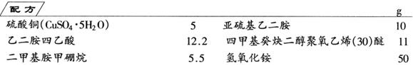 制法 将全部物料混合均匀,即为镀铜液。 使用时,先将含SnCl2 50g/L和HCl10ml的水溶液浸泡预处理印刷电路板,然后将其浸入本配方的镀液中,铜沉积速度为8.5μm/h,可形成牢固的延性铜膜。 |