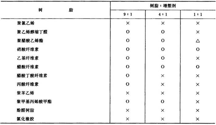 表1-40 甘油二醋酸酯与树脂的相容性