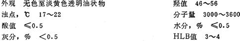 性能 低温下溶于水,高于浊点时在水中呈扩散状。具有良好的消泡及抑泡作用。 质量规格(海安石化总厂)