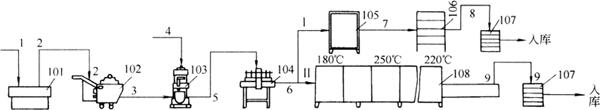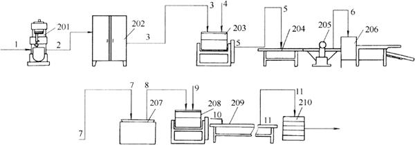 图5-2-5 江米条生产工艺流程图 1-江米粉、水 2-面浆 3-面糊 4-饴糖、江米粉 5-面团 6-面块 7-江米条生坯 8-油炸熟制的江米条 9-糖浆、桂花 10-挂浆后的江米条 11-冷却后的江米条 201-搅拌机 202蒸箱 203、208-调粉机 204-案板 205-辊轧机 206-江米条成形机 207-油锅 209-冷却输送带 210-成品箱