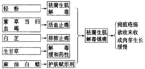 【要点】 方中轻粉为主药,功能祛腐蚀疮,疮疡溃后,新肉不生,大多因于腐肉不能尽去,故祛腐最为关键。余药则助主药以活血、止痛、排脓生肌。