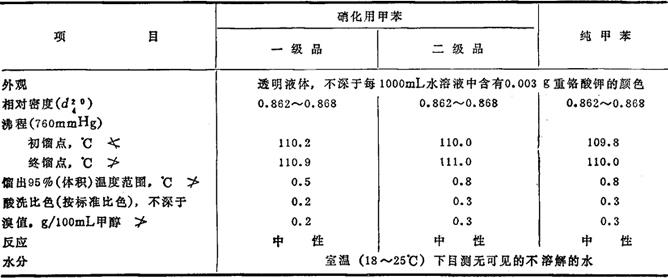 )1.497,闪点4.44℃,自燃点536.1℃。溶于乙醇、苯及乙醚,不溶于水。在空气中的爆炸极限1.27~7%。毒性:中等毒性。对皮肤、粘膜刺激性大,对神经系统作用比苯强。因甲苯最初被氧化生成苯甲酸,对血液并无毒害。工作场所最高容许浓度为200ppm(750mg/g)。