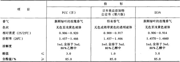性状 无色至微黄色液体,沸点216℃,闪点86℃,溶于油类,不溶于水、丙二醇和甘油。具青香带干甜,有新鲜、轻扬、青的玫瑰叶和月季气息,有些果香。