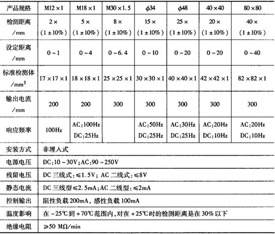 图1-128 电容式接近开关的安装 注:Sn为电容式接近开关的标准检测距离。 4.电容式接近开关常用产品型号及主要技术参数 电容式接近开关主要技术参数见表1-162。 表1-162 电容式接近开关主要技术参数