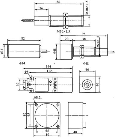 5.电容式接近开关外形及安装尺寸 电容式接近开关外形及安装尺寸见图1-129。
