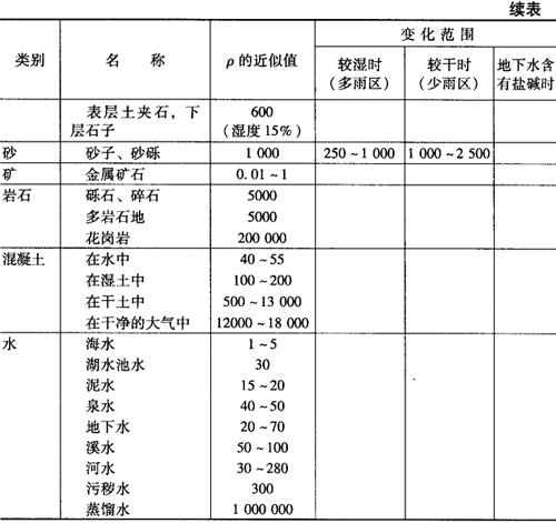 | 释义 | 电气装置接地的要求 1.一般要求 (1)按照电气装置的要求,保护性接地和功能性接地可采用共同或分开的接地系统,但采用共用接地系统时,应首先满足保护性接地要求。 (2)建筑物内每套电气装置在电源进线处,都应设置总接地端子以连接保护干线、接地线和工作接地线,并用等电位联结干线(1)分别与装置外导电部分及建筑的金属构件相连接。 (3)交流电力设备应充分利用自然接地设施接地,但应校验其热稳定性,不合格者不能做为接地设施;金属水管在得到所属部门同意后可当接地极使用,但同时还应有其他接地设施。 (4)人工接地设施应首先推荐在直接与大地接触的建筑物外墙基础内底部埋置环形水平接地体。 2.架空线路杆塔的接地系统 (1)在土壤电阻率(不同土壤和水的电阻率见表11-2)ρ≤100Ω·m的潮湿地区,可利用铁塔和电杆的自然接地,不必再另设接地极,但变电所的进线段除外。 表11-2 不同土壤和水的电阻率ρ/Ω·m