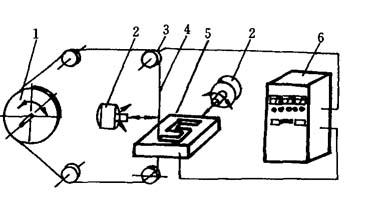 图3-21 电火花线切割原理 1—贮丝筒;2—工作台驱动电机;3—导轮;4—电极丝;5—工件;6—脉冲电源 工件接高频脉冲电源的正极,电极丝接负极,即采用正极性加工,电极丝缠绕在贮丝筒上,电机带动贮丝筒运动,致使电极丝不断地进入和离开放电区域,电极丝与工件之间浇注工作液介质.当高频脉冲电源通电后,随着工作液的电离、击穿,形成放电通道,电子高速奔向正极,正离子奔向负极,于是电能转变为动能,粒子间的相互碰撞以及粒子与电极材料的碰撞,又将动能转变为热能.在放电通道内,正极和负极表面分别成为瞬时热源,达到很高的温度,使工作液介质汽化、热裂分解、金属材料熔化、沸腾、汽化.在热膨胀、局部微爆炸、电动力、流体动力等综合作用下,蚀除下来的金属微粒随着电极丝的移动和工作液的冲洗而被抛出放电区,于是在金属表面形成凹坑.在脉冲间隔时间内工作液介质消电离,放电通道中的带电粒子复合为中性粒子,恢复了工作液的绝缘性.由于加工过程是连续的,步进电机受控制系统的控制,使工作台在水平面沿两个坐标方向伺服进给运动,于是工件就逐步被切割成各种形状. |