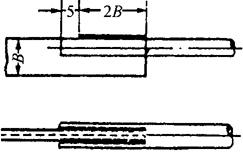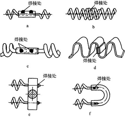 图10-13 电热丝与引出带的焊接方法 (2)电热元件间的焊接:在巨型电炉中,往往需用很长的电热元件,元件单根的重量超过标准重量,或者超过制造厂可能制造的长度,则需要焊接。在焊接处应该具有与元件本身同样的热稳定性,因此焊接处与其他部分的尺寸力求一致,这在实际施工上是困难的。我们应该尽量避免焊接,或者选用适当的形式来避免接合处过热,使用适当的形状降低它的表面负荷。几种常用的焊接办法如图10-14所示。