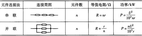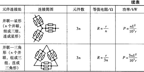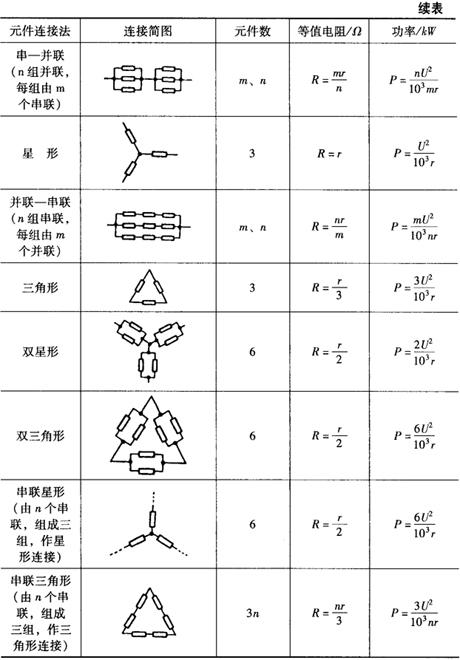 图10-14 电热元件的焊接法 (3)电热元件修理时的焊接法: ①未用过的元件:线状元件若在搬运、安装中发生断裂时,可将断头处在700~800℃时加热校直,然后用图10-14所示的方法焊接。带状元件断裂时,也可以将断头处先加热到700~800℃,校直3倍宽度,将同样尺寸的带材用钳子夹紧进行焊接。 ②已经高温用过的元件:方法与未用过的相同。应特别注意的是铁-铬-铝合金使用过后塑性很低,不可用力拉伸或重绕,最好在炉内焊接。 2.电热元件连接方法(供电电压)的选择 常用的电阻炉、小功率(5~10kW)电热设备都使用单相220V或380V,对于温度较低的电炉也可设计成三相380V;大于10kW的电热元件一般均采用三相380V。 每组加热元件以30~60kW为宜,即每相10~20kW(相应的电热元件直径为4~6mm),在设计时可根据总功率,用几组并联方式来达到上述参数。 一般连接方式可参阅表10-33。 表10-33 电热元件连接方式