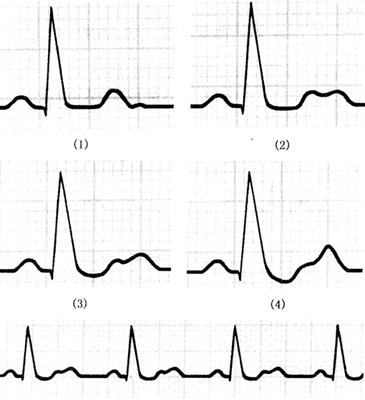图135 血钾浓度与心电图变化的关系 (1)血钾正常;(2)、(3)、(4)血钾浓度递增 ·血钾>5.5mmol/L,心电图可表现为T波高耸,Q-T缩短; ·血钾>6.5mmol/L,心电图可表现为QRS增宽; ·血钾>7.0mmol/L,心电图可表现为P波振幅减小,时间延长; ·血钾>8.5mmol/L,心电图可表现为P波消失,可出现窦性停搏; ·血钾>10mmol/L,心电图可表现为缓慢的正弦波(QRS与T波融合),可出现室颤或室性停搏。 高大T波还可见于: ·变异性心绞痛; ·超急性期急性心梗; ·早期复极综合征等。 高血钾症的心电图变化如图136所示。