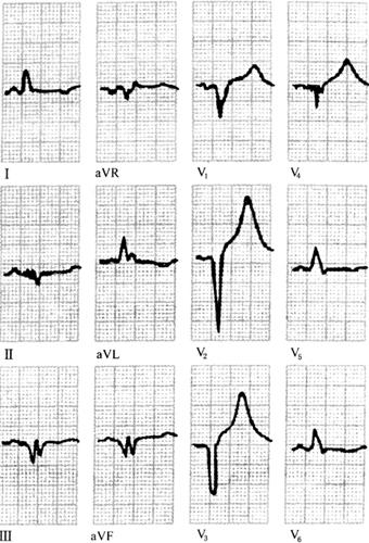 图136 高血钾症的心电图变化 高血钾症的其他心电图改变还有:Ⅲ度房室传导阻滞、交界性逸搏心律、心梗样改变、左束支或右束支阻滞等。 (3)症状:高钾血病人可出现疲乏、四肢无力、动作迟钝、肌麻痹、腱反射消失等。心电图提示高钾血症时,应急查血钾水平,一旦证实,应予积极治疗。 (4)高血钾症的治疗包括: ·停用保钾利尿剂和钾剂等; ·胰岛素加50%葡萄糖; ·钙剂; ·利尿剂[呋塞米(速尿)]; ·降钾树脂口服; ·血透。 2.低钾血症(hypokalemia) 血钾<3.5mmol/L被称为低钾血症。 (1)低钾血症的心电图改变(图137)为: