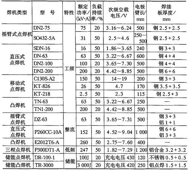 | 释义 | 电阻焊 电阻焊是指工件组合后通过电极施加压力,利用电流通过接头的接触面及邻近区域产生的电阻热进行焊接的方法. 9.2.1.1 电阻焊设备 电阻焊设备是指采用电阻加热原理进行焊接操作的一种设备.电阻焊设备包括点焊机、缝焊机、凸焊机和对焊机,有些场合还包括与这些焊机配套的控制箱. 1.点焊机和凸焊机 点焊机和凸焊机包括: (1)摇臂式点焊机.这是最简单、最通用的点焊机,既传递电极压力,也传递焊接电流.这种焊机有三种操作方法:气动、脚踏和电动机-凸轮.摇臂式点焊机不适宜作凸焊. (2)直压式点焊机.直压式点焊机适用于点焊和凸焊. (3)移动式点焊机.移动式点焊机分为两类:悬挂式点焊机和便携式点焊机.移动式点焊机的最新发展是将焊钳安装在机械手上,通过计算机控制,使机械手按指令进行点焊操作,并可将多台机械手安装在生产线上同时对工件不同部位施焊,从而显着地提高了生产率. (4)多点焊机.多点焊机是大批量生产中的专用设备.一般采用多个阻焊变压器及多把焊枪工件形状分布. 典型点焊机和凸焊机的主要技术参数如表9-29所示. 2.缝焊机 缝焊机除电极及其驱动机构外,其他部分与点焊机基本相似.缝焊机的电极驱动机构由电动机通过调速器和万向轴带动电极转动.有三种普通类型的缝焊机:横向缝焊机、纵向缝焊机和通用缝焊机.典型缝焊机的主要技术参数如表9-30所示. 3.对焊机 对焊机一般有闪光对焊机和电阻对焊机两类.典型闪光对焊机的主要技术参数如表9-31所示,典型电阻对焊机的主要技术参数如表9-32所示. 表9-29 典型点焊机和凸焊机主要技术参数