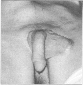 图217 切除的睾丸肿瘤 (2)阴囊疼痛 睾丸扭转会引起一侧阴囊的剧痛,通常突发,患者常于数小时后就诊。可有类似轻微、自行缓解的前驱症状出现。扭转对十几岁的男孩都会造成影响。一侧阴囊的疼痛也可由睾丸鞘突的扭转或创伤引起,但是除了最严重的状况外,创伤性的疼痛都会很快缓解。对成年人,持续性的睾丸疼痛通常是附睾-睾丸炎引起的,可伴随肿胀、疼痛,有时有发热。近期可出现尿频、排尿困难,提示有尿路感染,如果患者有长时间的尿频、夜尿、尿流少及终末淋漓的症状,则提示有膀胱流出的梗阻。 (3)包皮疾病 在9岁之前包皮不能上翻是正常的。此年龄以下,不能上翻、排尿时膨胀、包皮外口轻微的间歇性疼痛都不是包皮环切的适应证,只有伴随包皮下脓性排出的明确感染病史和明显的瘢痕(纤维化包茎)时,才考虑环切。对成人来说,包皮不能上翻是不正常的,通常会造成卫生问题和影响性生活,需要进行环切。 包茎嵌顿是指由于远端包皮上翻引起的肿胀(图218)。其有不适和困窘感,也会发展为溃疡。如果吸出水肿液仍不能还原包皮,则需要紧急进行环切术。
