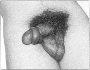 图218 包茎嵌顿,包皮上翻、龟头肿胀 所有常见的皮肤疾病都可以发生在阴茎上。对于疣或有梅毒可能的下疳病例,需要采集性接触史。阴茎癌通常发生于龟头和包皮之间的沟。其在西方和环切术后的男性少见。其可以表现为肿块或者包皮下血性或感染性的排泄物。包皮通常不能上翻,但是这很有可能是发生阴茎癌的原因之一而不是并发症。 (4)其他阴茎疾病 关于阴茎疾病的询问应该是非常细心的,因为通常患者是很困窘的。 尿道下裂是一种先天性畸形,其尿道开口比正常要近。轻度的尿道下裂不引起问题,或只有尿液喷溅的症状。而开口于阴茎体甚至阴囊上会导致严重的排尿和性功能障碍。会引起勃起疼痛(阴茎弯曲)。尿道下裂的患者通常会有不正常的“背侧”包皮,但绝对不能环切,因为其在重建的手术中会用到。 (5)Peyronie ’s病是一种影响阴茎体的局部的纤维瘤病。它会引起阴茎勃起时弯曲,从而影响性功能。其可能与Dupuytren’s挛缩有关,但却找不到相关性的因素。 尿道分泌物通常伴随排尿困难,常由衣原体感染和淋病引起。应该采集性接触史,并嘱患者于性病门诊就诊。 8.3.2 患者检体 患者应该取仰卧位,完全暴露腹部和生殖器。 (1)视诊 这一步包括腹部(包块、充盈的膀胱),腹股沟区(疝、淋巴结)以及阴茎和阴囊。通常患者所述的病症应该立即能看出。对成人和青年人,应该上翻包皮检查是否有包茎和潜在的病症。如果有包茎而不能上翻,则应该考虑环切。 (2)触诊 阴茎的触诊可以辨出Peyronie’s氏病患者阴茎体纤维化的部分,但对大多数疾病意义不大。阴囊内容物的触诊目的是辨别正常的结构及异常情况与这些结构的关系。应该用双手轮流固定每个睾丸。睾丸本身很敏感,应该轻柔触摸。睾丸呈均一、柔软的固性状态,注意可能提示肿瘤的散在包块和硬化部位。年长的人的睾丸弥漫肿大和较剧烈的触痛可能提示睾丸炎。此外,触诊时注意保护病人的隐私。 附睾应该在睾丸后被触到。正常应该是柔软的,但有附睾炎时可以肿胀、硬化和触痛。如果炎症轻微,这些改变可以是限局性的。附睾上极的柔软结节可能是扭转的睾丸鞘突。 对积液的患者,睾丸鞘膜内的液体可能使睾丸本身触摸不到。正常的附睾应该可以从后面触摸到。附睾囊肿都出现于睾丸后面,可能会使附睾余下部分触摸不清,但正常的睾丸应该在前面触摸到。这两种疾病开始都可能与腹股沟阴囊疝相混淆,但可以通过精索的触诊鉴别开来。由腹股沟疝导致的肿胀是不可能触及上面的,而在积液和附睾囊肿的上面却可以用四指和拇指触及正常的精索。 除了触诊,阴囊肿胀还可以在暗室中用笔式手电进行透光检查(图219)。对积液和附睾囊肿,当光源置于其后时会发亮。这一实验证明肿物是充满液体的,可以将其与临近正常的睾丸区别开来。该实验还可以将其与疝鉴别开来(虽然通过触诊已经可以鉴别),但是对于婴儿则不行,由于疝相对较小,也可以是透光的。