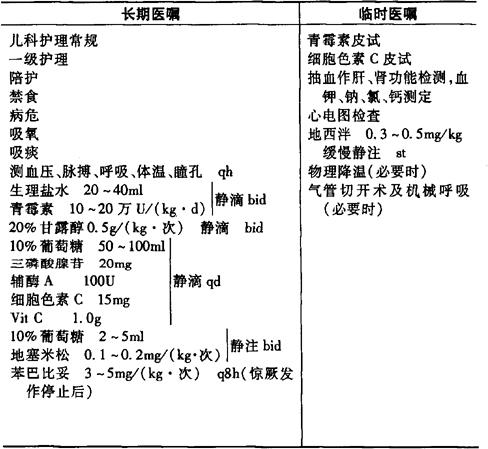 说明:1.对本症应作急症处理,尽快控制发作,首选地西泮缓慢静推,按每分钟1mg速度,必要时20分钟后可重复应用1次,用各种常用溶液稀释地西泮,均产生混浊,但不影响使用。如地西泮无效者,可静脉注射苯巴比妥钠,负荷量按20mg/kg计算,首次10~15mg/kg静脉注射,如15分钟未能控制,再用5mg/kg,可重复1~2次。上述药物对呼吸和心脏均有抑制作用,故应注意注射速度,密切观察心率及呼吸,最好在心电监护下操作。