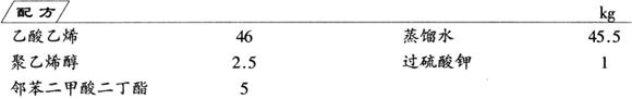 把聚乙烯醇与蒸馏水放入反应锅中,缓慢加热,使之升温到80℃,并且一定要搅拌均匀,过4~6h使之完全溶解。待温度降至60~65℃后,进行保温。一边按配方量的15%加入乙酸乙烯,一边按配方量的40%加入过硫酸钾。因为在反应时有热量放出,温度开始慢慢升高,在温度升到80℃左右时,按照配方用量分次加入乙酸乙烯,每次加10%,在6~8h内添加完毕。在逐步加入乙酸乙烯的过程中,同时每小时加入过硫酸钾用量的4%~6%,等到乙酸乙烯加完后,将剩余的过硫酸钾全部倒进锅内,这时温度上升到90~95℃,保温30min。冷却至50℃时,添加增塑剂邻苯二甲酸二丁酯,并且将之搅拌均匀。经过在空气中的自然冷却,降至室温,包装,即得成品。