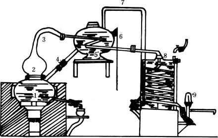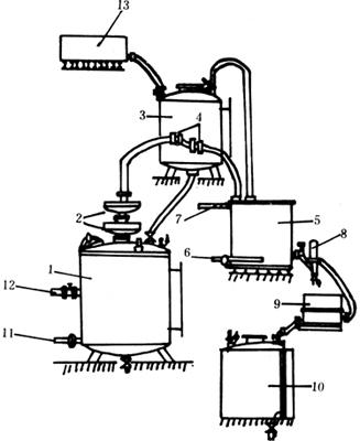 图5-3-1 夏朗德式蒸馏锅设备系统 1-蒸馏锅 2-锅帽 3-鹅颈管 4-温酒进管 5-酒预热器 6-冷空气管 7-回收酒气管 8-冷凝器 9-验酒器 夏朗德式蒸馏锅,除了用直接火加热外,也可用间接蒸汽加热。用间接蒸汽加热的夏朗德式蒸馏锅,锅体为圆锥形或圆柱形,如图5-3-2所示。