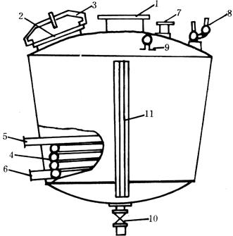图5-3-2 间接蒸汽加热的夏朗德式蒸馏锅 1-接球形分馏器 2-人孔 3-封盖 4-螺旋盘管 5-进汽阀 6-排汽阀 7-供料阀 8-空气阀 9-压力表 10-排糟阀 11-液位计 用间接汽加热的夏朗德式蒸馏锅,整个设备系统如图5-3-3所示。