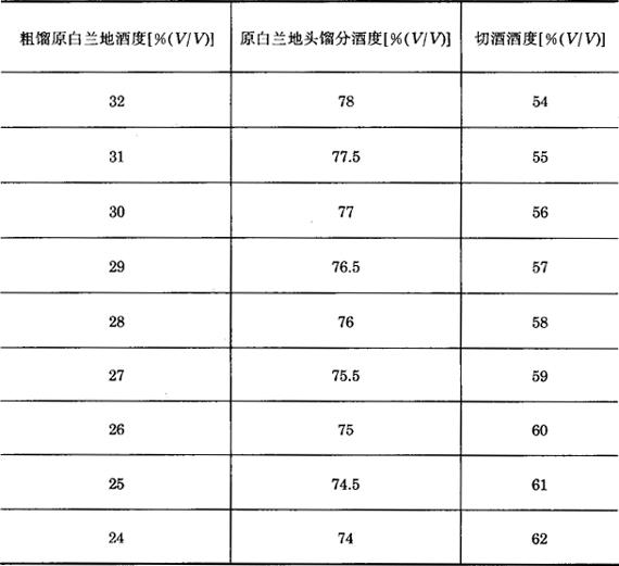 图5-3-5 带两个分馏盘的一次蒸馏设备系统 1-蒸馏锅 2-分馏盘 3-预热器 4-三通阀 5-冷却器 6-进水阀 7-出水阀 8-验酒器 9-承酒器 10-贮酒桶 11-进汽阀 12-出汽阀 13-高位槽 二、原白兰地的蒸馏方法 适宜的蒸馏设备,还要有正确的蒸馏操作和蒸馏方法,才能得到高质量的原白兰地。原白兰地蒸馏的目的既要得到纯粹的乙醇成分,又要得到与乙醇相伴随的芳香物质。 采用夏朗德蒸馏设备,需要进行两次蒸馏。第一次蒸馏白兰地原料酒,得到粗馏原白兰地,然后将粗馏原白兰地进行重蒸馏,掐去酒头和酒尾,取中馏分,即为原白兰地。 (一)粗馏原白兰地的蒸馏方法 粗馏原白兰地的蒸馏方法,在法国又叫开锅酒的蒸馏方法。是指将白兰地原料葡萄酒装入夏朗德式蒸馏锅里,通过直接蒸馏,得到二十几度的粗馏原白兰地。这种蒸馏一般不掐酒头,但为了使粗馏原白兰地达到要求的酒度,需切取一定的酒尾,并将其回入白兰地原料酒中,蒸入下一锅的粗馏原白兰地中。 粗馏原白兰地的酒度,与所使用的原料葡萄酒的酒度密切相关。如果原料葡萄酒含酒精度高,那么粗馏原白兰地的酒度也必然高。 一般粗馏原白兰地的酒度在26~29度时,通过第二次蒸馏可以得到高质量的科涅克原白兰地。如果白兰地原料葡萄酒的酒度为7度,就从馏出液7度时开始切取酒尾;9度的白兰地原料酒从4度开始切酒尾;当原料葡萄酒为11度时,则应等到馏出液的酒度为2度时才开始切酒尾。按此操作,可控制粗馏原白兰地的酒度大体在26~29度之间。如果粗馏原白兰地的度数在30度以上,那么重蒸馏时就应该添加适量的水,把酒度降低到29度以下。 (二)原白兰地的蒸馏方法 把粗馏原白兰地投入夏朗德式蒸馏锅里,用文火蒸馏,掐去酒头,切去酒尾,取中馏分(又叫酒心)即为原白兰地。 根据原料葡萄酒的质量,来确定截取酒头的数量。质量好的原料酒截取酒头数量要少;质量差的原料酒,截取酒头要多些。一般按纯酒精计算,截取总酒分的0.5~1.5%为酒头馏分。 截取酒头的数量也不是越多越好。如果截取酒头的数量过多,会使构成白兰地的芳香成分受到损失,从而影响成品白兰地的芳香成分,影响成品白兰地的质量。 将酒心与酒尾分开,法国称这个操作为“切酒”。一般从58度切酒较为适宜,但要根据具体情况灵活掌握。 理想的原白兰地酒度应该在70度左右。为了蒸得70度的原白兰地,切酒的酒度如表5-3-9所示。 表5-3-9 蒸馏得到70度原白兰地的切酒酒度