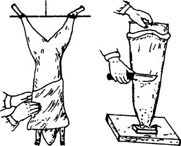 | 释义 | 皮用兔的饲养管理特点 皮用兔是指专门用以取皮的獭兔而言的,獭兔的饲养管理基本要求和其他家兔大同小异。本节主要介绍獭兔的特点及采皮技术。 1.獭兔皮的特点 獭兔有黑、白、红、棕、黄、灰、褐等10余种颜色,可谓色彩斑斓,是非人工印染所能得到的佳品。獭兔的毛皮具有美、平、轻、柔、细、密、短的特点,是一种名贵的皮用兔。所谓“美”,就是外表非常美丽好看,毛皮色型多,光泽好,具有丝绸及平绒样的手感;所谓“平”,就是兔毛的长短平整如一,无凸凹旋涡和戗毛出现;所谓“轻”,就是单位面积的皮毛重量轻,拿在手里没有重压感;所谓“柔”,就是毛皮质地细腻柔软;所谓“细”,就是绒毛纤维直径小,针毛不突出绒毛之外;所谓“密”,就是兔皮单位面积的绒毛根数多,紧凑结实,手感丰满;所谓“短”,就是绒毛纤维短,普通家兔的毛长约3厘米,而獭兔毛长仅1.5~1.6厘米。 2.獭兔毛绒的生长特点 獭兔毛绒的脱换和一般家兔一样,也是有规律的。仔兔出生3天即长出细微的绒毛,5天较为明显,7~8天全身绒毛长齐,出现其本身固有的色别。15日后背毛最光润,美似水獭。15~30日龄是绒毛生长最快的时候。30日龄后背毛长到一定长度就不再生长。 獭兔幼兔的兔毛要经过两次脱换,45~60日龄开始脱换胎毛,长出细密的绒毛,130~150日龄第二次换毛。第二次绒毛脱换后,绒毛生长停止,有色兔色素合成停止,色泽光润,就成了标准的皮毛,此时便可采取皮张。 成兔和一般家兔一样,属季节性换毛,一般3~4月份脱去冬毛,9~10月份脱去夏毛。由于饲养方式和条件好坏不一,对獭兔的换毛有一定影响。通常是营养水平高的和青年兔换毛快,营养不良及老弱病残兔换毛慢。獭兔与一般家兔还有一个不同的特点,即换毛期其食欲不佳,长期不发情,且配种受胎率低。此时应切实加强饲料营养的补充,提高饲料的适口性。 换毛期的獭兔背毛色泽暗淡不一,毛峰不齐,凸凹不平,其皮张利用价值不高。此时不可宰杀取皮。有外伤和患有疥癣病的兔皮质量不好,夏季及分娩后哺乳母兔的皮张质量最差,在宰杀取皮时要特别注意。 3.提高獭兔皮质量的措施 (1)獭兔皮的质量与饲料营养关系较大,要按獭兔毛皮生长特点提供全价饲料。消化能应在11.30%以上,粗蛋白应在16%~18%,且掌握前期高后期低的原则。 (2)商品獭兔实行小群饲养,断奶后公母分笼。公兔必须去势饲养。 (3)獭兔不可与一般家兔杂交,以保证其皮板品质纯度。 (4)合理安排配种繁殖计划,适时取皮,不取换毛皮,不取疥癣兔皮、夏季兔皮、哺乳母兔皮。 (5)掌握獭兔换毛规律,提倡春夏繁殖多留种,秋冬多取皮。 (6)改善饲养条件,合理配合饲料,讲究笼舍卫生,强化前期管理,缩短饲养周期,保护毛皮色泽质量。 4.獭兔皮的取皮方法 饲养獭兔,贵在取皮。取皮应在最适当的时候即皮毛质量最好的时候进行。取皮要掌握毛皮不受损伤和污染的原则,如果取皮不当,就会降低经济效益。 (1)取皮方法:獭兔取皮不可采用一般家兔先宰杀放血后剥皮的传统方法,应当采用先处死剥皮,皮肉分离后再放血的新方法。这样可以防止兔皮受损伤、兔血污染毛皮。 (2)处死方法: 棒击:左手将獭兔两条后腿抓紧提起,使其头朝下,然后用直径3~4厘米的木棍朝兔两耳根猛击一下即死。棒击时要稳、准、狠,并不许将头颅击破出血。 打空气针:即在兔耳静脉注射10毫升左右的空气,使脑血管栓塞致死。 另外,还有电麻法、灌醋法及颈椎错位法等,可根据情况使用。无论使用哪种方法将兔处死,都要注意不要损伤兔皮和血液污染兔毛。 (3)剥皮方法:将兔的右后腿用绳子或铁丝拴起,倒挂在树杈或专用的柱子上,割去尾巴,用锋利的剥刀自左腿飞节处,沿两条大腿内侧、阴部上方的平行线捅开,而后将大腿毛皮剥开向外翻。翻过臀部之后,用力将整张皮筒倒拉下来(俗称倒扒皮),到脖颈耳根再将皮张截开,即成毛朝里皮朝外的皮筒。如需要剥平板皮,在皮筒没与头部分割时,自下巴沿腹部中线割开,然后再将前腿套筒割开,即成长方形的板皮(图3)。