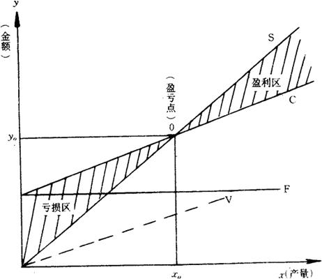 当S=C时,企业利润为零,交点O为盈亏平衡点。x0是盈亏平衡时的产品数量。若产量>x。企业盈利,反之亏损。因此在生产实际中掌握盈亏平衡点十分重要。计算盈亏平衡点可用以下的方法: