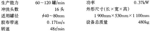 工作时,空罐倒立放在输入端的输送带输入,送入清洗罩内的初洗区,热水管喷头喷出压力0.35~0.45MPa的热水从上、下两个方面喷洗罐的内外壁。污水由污水收集箱经排水管排出。再进入终洗区进行清洗。汽水混合箱中的高压蒸汽可以将水加热到80℃左右,压力0.15MPa左右,集中在水箱,由水泵送往清洗区使用。