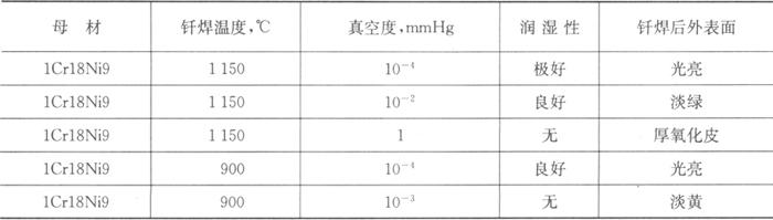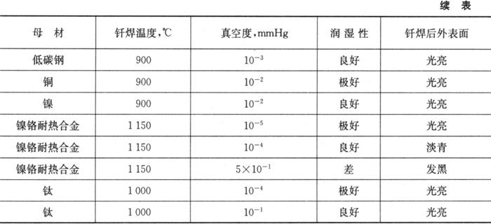 不同金属在不同温度下真空钎焊时所要求的真空度是不一样的,各种材料真空钎焊时真空度与润湿性关系如表10.5-2所示。含锌、镉、锂、等高蒸气压元素的钎料不适用于真空钎焊。
