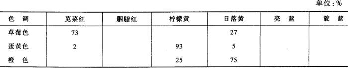 几种色调混合配比见表1-3-10。 表1-3-10 几种色调的食用着色剂配合比 单位:%