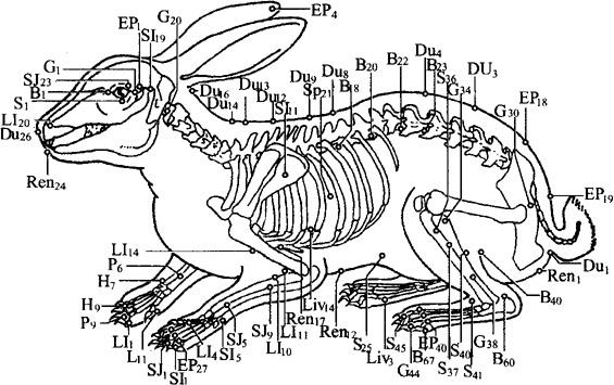 图12.3 兔的骨骼及实验穴位