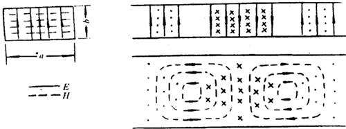 | 释义 | 矩形波导 矩形波导是由横截面为矩形的空心金属管构成的传输线,它只能传输TE波或TM波,不能传输TEM波。 1.矩形波导的主模——TE10波 在矩形波导中,能通过的电磁波的最大截止波长,即最低的模式称为主模。矩形波导的最低的模式是TE10波,其场结构如图7.4-2所示,图中实线为电力线,虚线为磁力线。