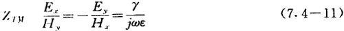 式中,v——TEM波在媒质中的波速,在真空中v=c。 由式(7.4-7)可知,vp>v,即矩形波导内TE波和TM波的相速大于TEM波的波速;vp是频率的函数,因此矩形波导是一种色散传输系统;vp与传播的波型有关。 3)群速vg 群速是等幅度点前进的速度,也就是能量传播的速度。群速vg与vp和v有如下关系: vgvp=v2 (7.4-8) 由上式知,矩形波导中波的群速小于TEM波的波速v。 4)波阻抗 矩形波导的波阻抗在数值上规定等于横向电场和横向磁场的比值。对于横电波(TE波),