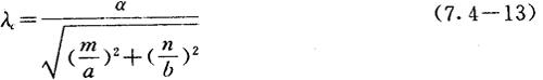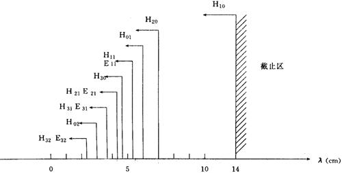 式中,a——波导宽边内尺寸;b——波导窄边内尺寸;m、n——波型次数。 如果a、b尺寸给定,就可计算出截止波长的值。例如,当a=7.0cm,b=3.0cm,则可按式(7.4-13)计算出各种波型的截止波长,依大小排序如图7.4-3所示。