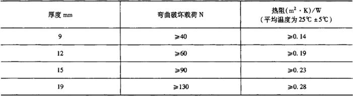 (3)体积密度 吸声板的体积密度应不大于500kg/m3。 (4)含水率 吸声板的含水率应不大于3.0%。 (5)弯曲破坏荷载和热阻 1)湿法吸声板的弯曲破坏荷载和热阻应符合表9-25的规定。 表9-25 湿法吸声板的弯曲破坏荷载和热阻