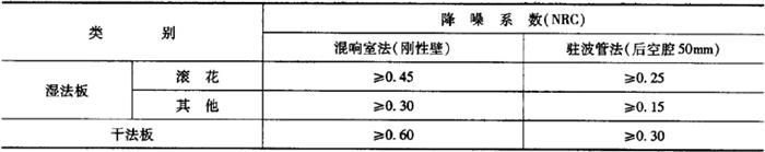 3)特殊厚度吸声板的弯曲破坏载荷和热阻要求,由供需双方商定。 (6)降噪系数 吸声板的降噪系数应符合表9-27的规定。并应注明试验方法。除非另有规定,混响室法为仲裁试验方法。 表9-27 矿物棉装饰吸声板的降噪系数