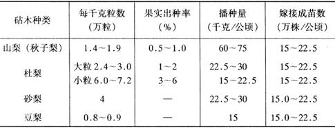 | 释义 | 砧木苗的培育 1.常用梨树砧木及其特点 (1)乔化砧 ①山梨 该梨为野生秋子梨,是我国北方常用的梨树乔化砧木,广泛分布于辽宁、吉林、黑龙江、内蒙古、河北、山西、陕西等地。 植株高大,叶片有光泽,枝条黄褐色,根系强大,须根少,生长旺盛,果实小,萼片宿存。抗寒性很强,能耐-52℃低温。寿命长,抗腐烂病、黑星病、抗旱力较强,适应性强。与秋子梨、白梨、砂梨的嫁接亲和力强,与西洋梨品种嫁接亲和力弱,与西洋梨某些品种嫁接后易患果实铁头病。 ②杜梨 也是我国北方常用的梨树乔化砧木。广泛分布于辽宁、内蒙古、河北、河南、山东、山西、陕西、甘肃等地。以河南、山东、陕西等省为常见。 根系强大,须根多,枝条开张下垂,枝上具刺。叶片为长卵圆形,果实小,圆球形,褐色。萼片脱落,耐旱,耐湿,抗盐碱,与多种梨品种嫁接亲和力好,但嫁接洋梨时,虽易愈合成活,但果实易患铁头病。其上嫁接的梨品种结果早、丰产、寿命长。杜梨的抗寒性也比较强,抗腐烂病能力中等。 ③褐梨 分布于山东、山西、河北等省。东北山地也有应用。在山东地区又叫棠杜梨,多用于山区。适应性强、抗旱、耐涝,与栽培品种嫁接后生长旺盛,产量也高,但结果较晚, ④豆梨 广泛分布于湖南、河南、江苏、安徽、浙江、江西、福建、贵州、云南、山东、四川等地。在山东某些地方也称其为杜梨。实生苗初期生长比较慢。根系强大,耐热。抗涝、抗旱、抗腐烂病能力较强,但抗寒性较差。是砂梨系统梨品种的优良砧木,与西洋梨品种的嫁接亲和力也比较强。 ⑤木梨与川梨 木梨广泛分布于甘肃、青海、宁夏、新疆等地。川梨广泛分布于四川、云南、贵州等省。大树均生根蘖,对腐烂病抗性较弱,与各系统梨嫁接亲和力均好,生长健壮,结果良好。木梨的抗旱性好,抗赤星病能力特强,根系强大,寿命长。 此外,麻梨为西北地区应用最多的耐寒、耐旱的梨树砧木。 (2)矮化砧 梨树也有矮化砧木。目前,普遍认为对梨有致矮作用的砧木是榅桲,最常用的有榅桲A、B、C三个类型。A型的各品种嫁接亲和力较强,扦插也易发根,但抗寒力较差,且不耐盐碱。C型矮化效果最强。梨的矮化砧,目前国内还没有用于大面积生产,仍处于试栽阶段。云南榅桲对中国梨品种有明显的矮化作用,也是西洋梨品种常用的矮化砧,其树冠矮小,结果早,但抗寒力较差,不耐盐碱,固地性差、寿命短。 中国果树所在梨矮化砧选育方面作了较多的工作,PDR54是中国果树所从香水梨与巴梨杂交后代中选出的极矮化砧木,以杜梨作基砧,PDR54作中间砧时,嫁接早酥梨,5年生树高为119.3厘米,相当于乔化砧的35.4%。S2、S3、S5是中国农业科学院果树研究所从锦香梨的自然实生苗中选出的矮化和半矮化砧木,用山梨做基砧,S2、S3作中间砧嫁接砀山酥梨,5年生树高分别为144厘米和114.5厘米,仅为乔化砧对照树的76%和53.9%。 上述矮砧(PDR54,S2、S3、S5)与早酥梨、砀山酥梨、锦丰梨、鸭梨、雪花梨、金花梨等嫁接亲和性都好,而且能早结果丰产,已在全国十几个省、直辖市应用试栽。 2.实生播种培育砧木苗 生产上梨树育苗普遍采用实生播种的方法繁育砧木苗。砧木苗的繁育过程与苹果基本相同。现将其与苹果砧木苗繁育过程中的不同之处阐述如下:各种梨砧木种子的采收适宜时间、层积天数见表7-3。各种梨砧木种子的播种量、千克种子粒数以及单位果实的出种率等见表7-4。 表7-3 梨砧木种子采收时间、层积日数表