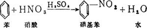 | 释义 | 硝基苯 1.性质 硝基苯为无色透明油状液体,工业品因含有杂质而使颜色呈微黄色,具有苦杏仁的臭味,纯品的沸点为210.9℃,熔点为5.7℃,商品的干品凝固点不低于4.5℃,硝基苯在水的溶解度为0.19%(20℃),易溶于酒精及乙醚。对人的血液有毒害作用,吸入或渗入皮肤均可能引起中毒症状。急性中毒者起初表示全身不适,头痛晕眩,眼花、呕吐、脸色苍白,严重的有呼吸困难、痉挛、甚至惊厥;慢性中毒表现出贫血,食欲减退,接触皮肤部分也可能发生结节型或渗出性湿疹。空气中最高容许浓度为5mg/m3。硝基苯为易燃易爆物,闪点为90℃,硝基苯是制造重要中间体苯胺的原料,亦用于制造其他中间体(如间硝基苯磺酸)、染料(如醇容黑)及用作染料及油漆的溶剂。 2.制法 硝基苯的生产方法是将苯被混酸硝化而成的,其反应式如下: