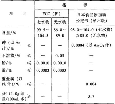 鉴别方法 呈现亚铁盐反应和硫酸盐反应。 1.亚铁盐反应 本品水溶液加新配制的铁氰化钾溶液(10%),即产生深蓝色沉淀。沉淀不溶于稀盐酸(1+3),但可被氢氧化钠溶液(4%)分解。 2.硫酸盐反应 本品水溶液加入氯化钡试液(10%),即产生白色沉淀。沉淀不溶于盐酸或硝酸。 毒理学依据 本品与一般重金属相同,可凝固蛋白质,具有收敛作用及防腐作用。大量吸收,则发生中毒、呕吐、腹泻、中枢神经麻痹及肾炎。 1.LD50 大鼠口服(以Fe计)279~558mg/kg(bw)。 2.GRAS FDA-21CFR 182.5315;182.8315;184.1315。 使用 铁强化剂、发色剂。 (1)我国《食品营养强化剂使用卫生标准》(GB 14880-94)规定:用于谷类及其制品,120~240mg/kg;饮料,50~100mg/kg;乳制品、婴幼儿食品,300~500mg/kg;食盐、夹心糖3000~6000mg/kg。高铁谷类及其制品(每日限食50g),860~960mg/kg。 (2)实际使用参考: ①用于面粉、面包等强化铁时,用量为26.4~30mg/kg。 ②本品尚可作为蔬菜、水果的发色剂使用。如用于糖煮蚕豆,原料豆经选择、充分水洗、浸渍后,加热放置3~4h,按原料量加入0.02%~0.03%(干燥量)的本品溶液于原料中后,再加3%左右的碳酸氢钠,在夹层锅中煮沸,排水,加糖煮沸后,再以小火煮制,豆软后将碳酸氢钠充分除去。与钾明矾(0.1%)合用,也可用于茄子着色。 |