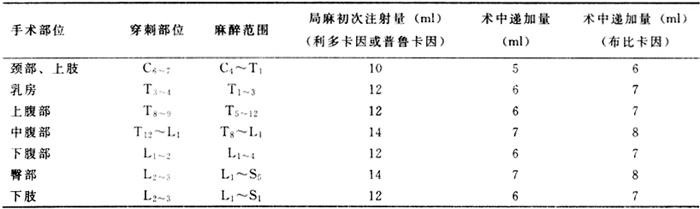 | 释义 | 硬膜外阻滞麻醉 硬膜外阻滞麻醉,是将麻醉药注入硬脊膜外腔而使一部分脊神经阻滞的麻醉方法。由于硬脊膜外腔内无脑脊液,只有疏松的结缔组织,从而限制了麻醉药的自由扩散,故可产生节段性阻滞,即根据手术需要选择性地阻滞若干对脊神经。该法止痛完善,肌肉松弛良好,有比较安全和麻醉时间可以随意延长等优点,是美容外科手术中应用较广的方法之一。 【穿刺部位与用药量】 见表10-2。 表10-2 美容外科手术的硬膜外麻醉穿刺部位与用药量