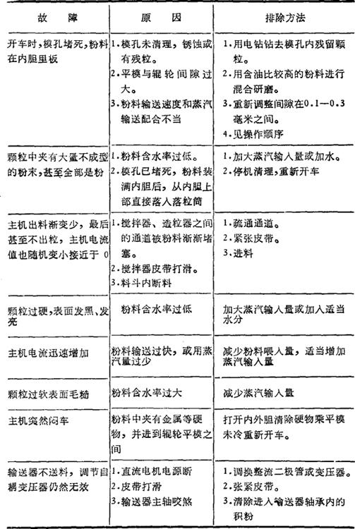 一般常用的鱼饲料配方,进机蒸汽压力为1公斤/厘米2左右。 硬颗粒饲料机的操作顺序: ①打开疏水器,疏清蒸汽管道中的积水。 ②起动机组中的提升机。 ③起动造粒机的主电机(此时,直流变压器处于0伏)。付主电机起动运转正常以后将变压器电压调到60伏,然后逐渐转动变压器手轮,增大电压,使输送器主轴转速逐渐升高。当造粒机出料口有少量零星饲料被送出时,方可开始向造粒机输送蒸汽。由于此时蒸汽压力较大,在开启蒸汽阀时,必须极其缓慢和谨慎,避免送汽过量。蒸汽是有助于粉料通过压模时起润滑剂作用,减少磨损后功率消耗。过多的蒸汽或水份使颗粒出模后自然膨胀,表面开裂,易在冷却后破碎;蒸汽太少成粒系数低。 停车时操作顺序: ①关断蒸汽阀门,停止送汽。 ②将变压器手轮调至0伏,使输送器停止送料。 ③切断主电机电源,在电机未完全停转时再次开车,如此反复数次。 ④停车后卸下造粒器的外胆,向内胆加入4-5斤鱼粉(也可用拌油粉料代替),重新起动电机,用鱼粉挤出原平模模孔中的颗粒把鱼粉压入模孔中。 ⑤清除平模及辊轮上的余料。 (4)常见故障及排除方法 见表5-7。 表5-7 故障产生原因及排除方法