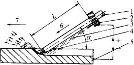 1-碳棒;2-气刨枪;3-压缩空气,4-电弧,5-工件,6-碳棒进给方向,7-刨削方向,L-碳棒伸出长度;α-碳棒与工件倾角