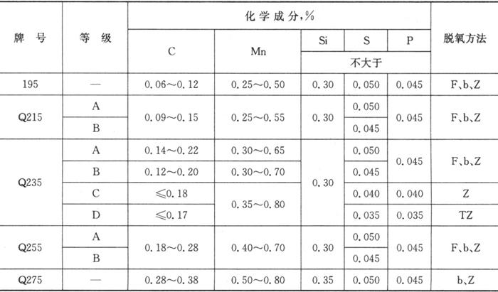 | 释义 | 碳素结构钢简介 钢的分类方法很多,按照化学成分、钢的纯度、冶炼方法、金相组织和用途的不同,可对钢进行不同的分类。我国常用的分类方法如下: 1.按化学成分分类 钢按化学成分可分为碳素钢和合金钢两大类。 (1)碳素钢 含碳量不大于2%的铁碳合金称为碳钢。根据钢中含碳量的不同,碳素钢一般还可以分为低碳钢、中碳钢和高碳钢。 低碳钢——含碳量一般不大于0.25%,主要用于建筑构件;也用于机械零部件。 中碳钢——含碳量通常在0.25%~0.60%之间,主要做机械零部件用,常常在调质状态下使用。 高碳钢——含碳量一般大于0.60%,主要作工具、弹簧及耐磨工件用,通常需经淬火处理及低温回火处理。 碳素结构钢一般属低碳钢,或含碳量在中碳钢的下限。 (2)合金钢 为了改善钢的某些性能而加入少量的一种或几种合金元素的钢。根据钢中合金元素总含量的不同,合金钢大致可分为低合金钢、中合金钢和高合金钢。 低合金钢——合金元素总含量不大于5%的钢。 中合金钢——合金元素总含量在5%~10%的钢。 高合金钢——合金元素总含量大于10%的钢。 2.按钢的纯度分类 钢按纯度可分为普通钢、优质钢和高级优质钢。 普通钢——一般含磷量不大于0.045%、含硫量不大于0.055%或者磷、硫含量均不大于0.050%。 优质钢——钢中磷、硫含量均不大于0.040%、含铜量不大于0.030%。 高级优质钢——钢中含磷量不大于0.035%、含硫量不大于0.030%、含铜量不大于0.025%。 3.按冶炼方法分类 根据冶炼设备和方法不同,可分为平炉钢、转炉钢和电炉钢。 按照钢的脱氧程度和浇注制度的不同,又可分为沸腾钢、镇静钢和半镇静钢三类。 沸腾钢——浇注前不用硅和铝脱氧,钢水中保留一定的含氧量,在钢锭模内产生沸腾现象,这类钢只限于生产碳与硅含量分别不大于0.25%与0.07%的钢种。 镇静钢——注入钢锭模前脱氧较完善,钢水在钢锭模内基本上不再产生氧化还原反应,生产的钢种不受成分限制。 半镇静钢——进行中等程度脱氧,介于镇静钢和沸腾钢之间,钢水在钢锭模内沸腾较弱,这类钢的碳含量范围比沸腾钢的宽。 我国国家标准GB/T 700-1988《碳素结构钢》适用于一般钢结构用热轧钢板、钢带、型钢、棒材,可供焊接、铆接和拴接构件用。 钢的牌号有代表屈服点的字母、屈服点数值、质量等级符号、脱氧方法等四个部分按顺序组成,以汉语拼音首位字母表示。 例如:Q235-A·F Q——钢材屈服点; 235——钢材最小屈服点(MPa); A、B、C、D——分别为质量等级; F——沸腾钢; b——半镇静钢; Z——镇静钢; TZ——特殊镇静钢。 在牌号组成表示方法中,“Z”与“TZ”符号予以省略。 表1.1-1、表1.1-2和表1.1-3列出了我国通常用于焊接构件的碳素结构钢的牌号、化学成分和力学性能。表1.1-4列出各国碳素结构钢牌号的对照。 表1.1-1 碳素结构钢的牌号及化学成分(GB/T 700-1988)