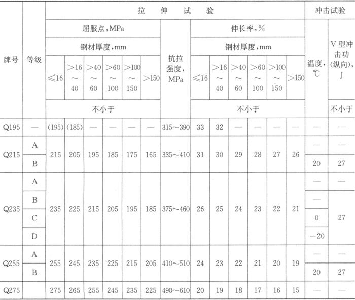 表1.1-2 碳素结构钢的牌号及拉伸和冲击性能(GB/T 700-1988)