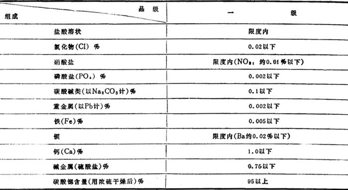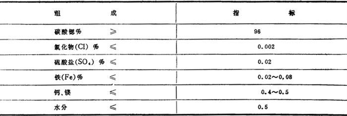结晶热 25℃ 840.984kJ/mol 结晶转变温度 920~930℃ 熵S 97.07J/(mol·℃) 自由能 -1137.63kJ/mol 折射率(钠光) 1.51 nβ1.664 nγ1.665 吸收光谱 692cm-1;845cm-1;1422cm-1 介电常数 18℃ 8.85 磁化率 -0.300×10-1c·g·s制电磁单位 二、化学性质 与氯化铵相煮沸,则转变为氯化锶而溶解,SrCO3+2NH4C1→SrCl2+(NH4)2CO3;溶于酸,放出二氧化碳,SrCO3+2HNO3→Sr(NO3)2+CO2+H2O;在含有二氧化碳的水中,以碳酸氢锶的形态而溶解,SrCO3+CO2+H2O→Sr(HCO3)2;在悬浮水中遇H2S时,生成硫磺。 三、用途 是生产锶盐的基本原料,用碳酸锶制得的玻璃,吸收x光线能力较强,因而近代多用于彩色电视阴极射线管的生产。碳酸锶可用于糖的精制,过去制糖工业曾是它的主要用途之一。用于电磁铁、锶铁氧体,可制成小型电机、磁选机以及扬声器等。作为钯的载体,用作加氢之用。锶玻璃对特定波长的辐射,有吸收能力。此外,也用于烟火的生产和荧光玻璃、信号弹、造纸、医药以及分析试剂等方面。 四、质量标准 我国碳酸锶的企业标准(川Q/自23-81)见表1-1-53。 表1-1-53 碳酸锶企业标准